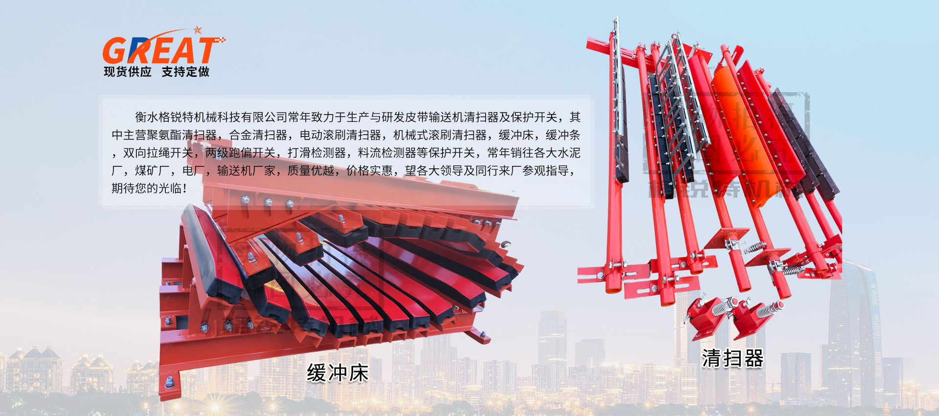 衡水格銳特機械科技有限公司常年致力于生產與研發皮帶輸送機清掃器及保護開關,其中主營聚氨酯清掃器,合金清掃器,電動滾刷清掃器,機械式滾刷清掃器,緩沖床,緩沖條,雙向拉繩開關,兩級跑偏開關,打滑檢測器,料流檢測器等保護開關,常年銷往各大水泥廠,煤礦廠,電廠,輸送機廠家,質量優越,價格實惠,望各大領導及同行來廠參觀指導,期待您的光臨?。。?/p>